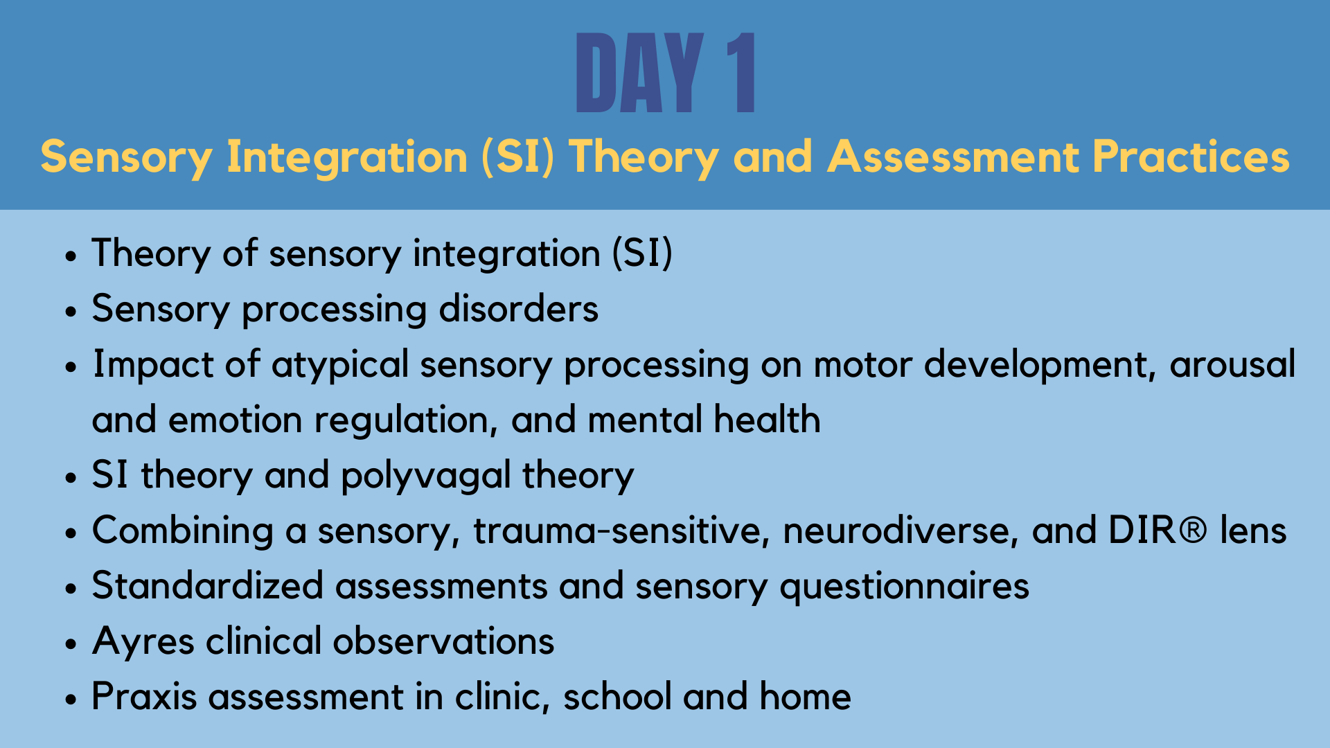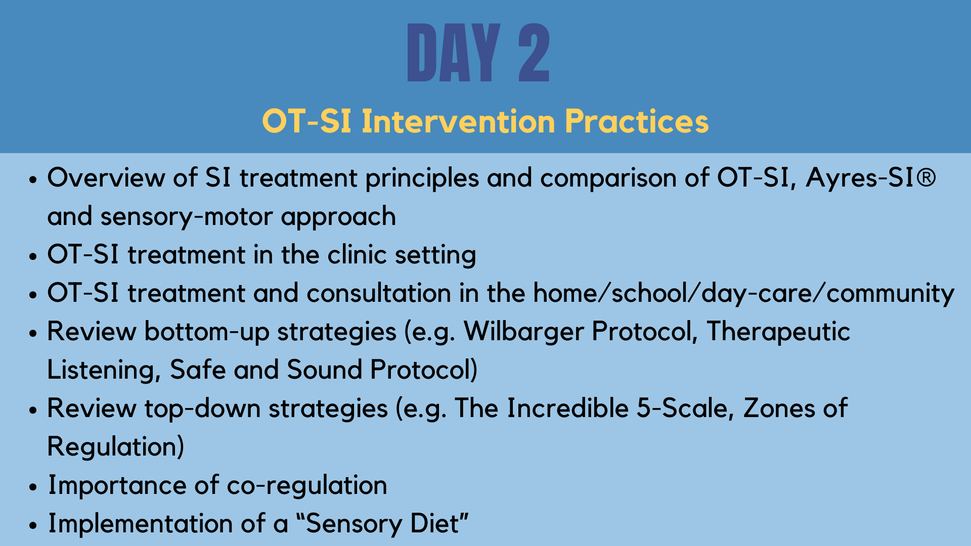Jessica consults and provides training on sensory processing and arousal regulation to both public and private schools, day care settings, camps, ABA providers, and mental health settings. Jessica has presented to occupational therapists on topics including sensory processing, arousal regulation, motor and play development, and feeding challenges.